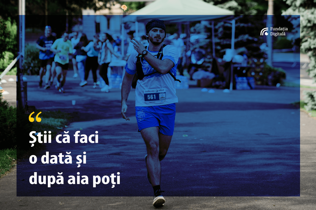(Denis) Prima oară chiar e o frică acolo, până nu alergi, zici băi, nu pot să alerg 5km. Pare foarte mult. Dar după aia, când îți zice lumea, Hai că o să fim toți, stăm toți acolo și o să mergem, în cel mai rău caz. Și când ești acolo, nu poți să mergi, că te motivează. Mai trece lumea pe lângă tine, mai sunt voluntarii. Mergi un pic, dar nu poți să mergi tot traseul.